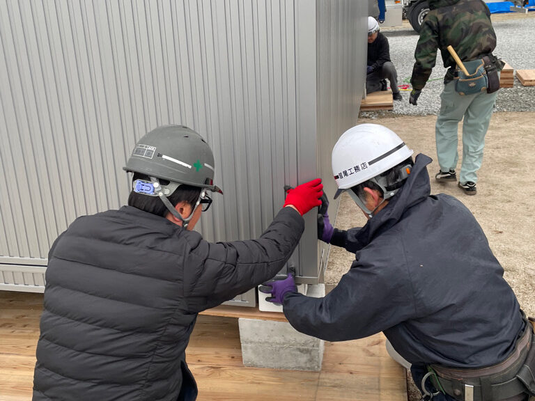 今回設置したのは大型の3連結モデル。 クレーンで吊り上げ、隣のユニットとガッチリ合わせるのですが、驚くほどスッと収まる。これはミヨシ産業さんの丁寧な仕事ぶりはもちろんですが、スマモの構造自体が歪みにくく、極めて正確だからこそ。 現場で手伝いながら、これだけ精度が出るなら、長く住んでも安心だと改めて確信しました。